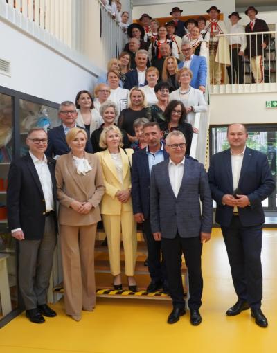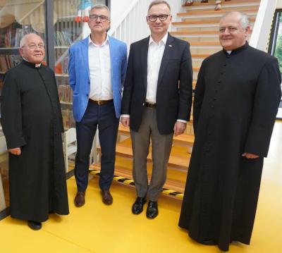 17 września prezydent minionej dekady Andrzej Duda wraz z małżonką Agatą Kornhauser - Duda zawitał do naszej Biblioteki - Powiatowej Miejsko-Gminnej Biblioteki Publicznej w Starym Sączu filii w Przysietnicy. Pani prezydentowa Agata w Bibliotece już była wraz z prezydentową Węgier na spotkaniu z przedszkolakami. Niecodziennych gości na parkingu powitał burmistrz Jacek Lelek, viceburmistrz Kazimierz Gizicki i dyrektor Monika Jackowicz – Nowak, a następnie oprowadzili ich po okazałym i nowoczesnym obiekcie. Budynek Biblioteki w Przysietnicy powstał podczas kadencji prezydentury Andrzeja Dudy. W krótkim czasie działalności Biblioteka gościła niezwykłe postaci, była świadkiem historycznych wydarzeń dla Przysietnicy. Tak też było i tym razem. Było to nieoficjalne spotkanie, dlatego też przyciągnęło na nie pracowników Biblioteki, przedstawicieli Stowarzyszenia Górali Popradzkich, zespół Czarnych Górali, mieszkańców, ciekawych obecności osób poprzednio ,,pierwszych w państwie”. Uczestnicy spotkania nie zawiedli się. Para prezydencka barwnie i z humorem opowiadała anegdoty, przygody jakie ich spotykały w czasie pełnienia tej funkcji pomijając politykę. Uczestnicy chłonęli ciekawostki zakulisowe ważnych wydarzeń w naszym państwie, o których nie pisała prasa. Wielu uczestników spotkania z przyjemnością robiło sobie zdjęcia pamiątkowe z parą prezydencką. Pan Andrzej Duda zainteresował się też Dziejami Przysietnicy, które z okazji tego spotkania zostało mu wręczone. (ZG)